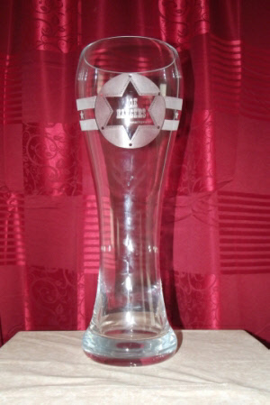 3-Liter-Weizenbierglas mit graviertem Stammtischlogo. Auf der Rückseite des Glases wurde jeweils ca. bei einem ½ Liter eine Markierung gesetzt.